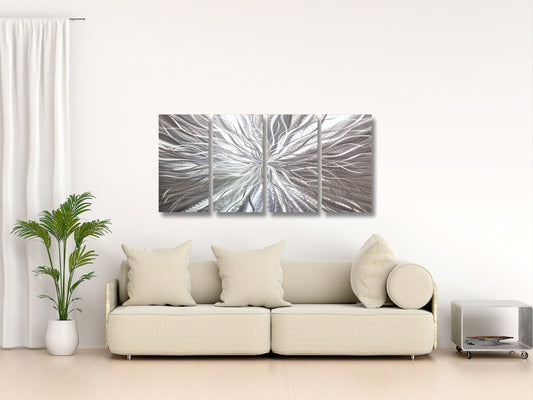 Silver Metal Wall Art – 4-Piece Modern Sculpture – Abstract Gallery Decor for Living Room