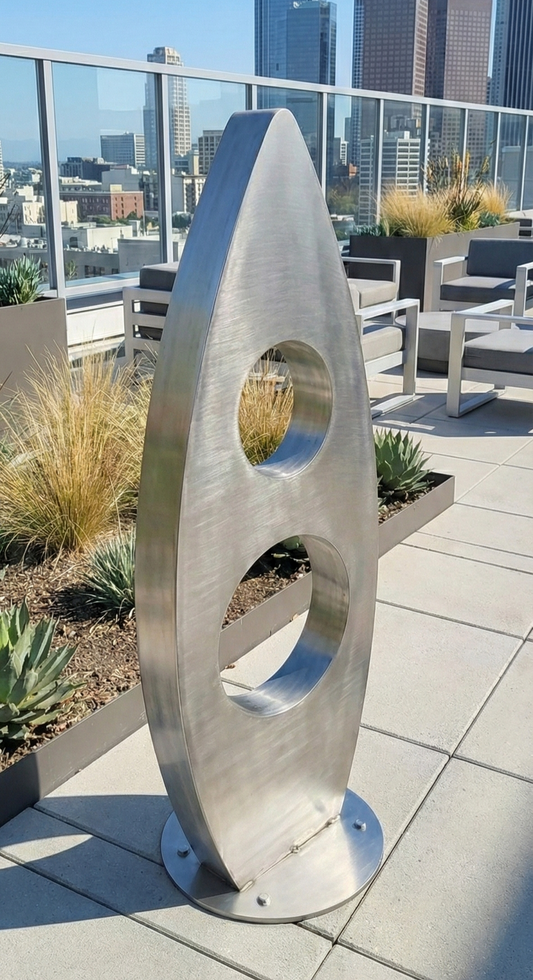 Crafted in stainless or mild steel, aluminium, copper, brass or bronze, each piece is built to live indoors or outdoors. Rain. Sun. Spotlight. Silence. It thrives in all of it. Polished surfaces catch the light. Raw textures add tension. Clean lines meet controlled chaos.