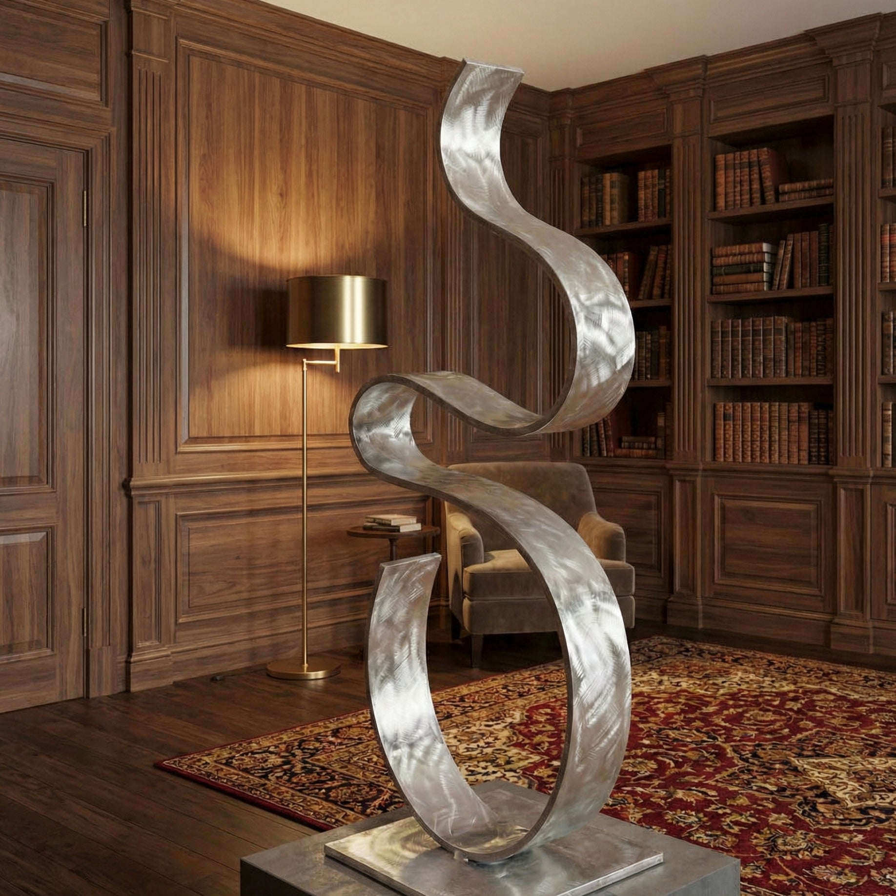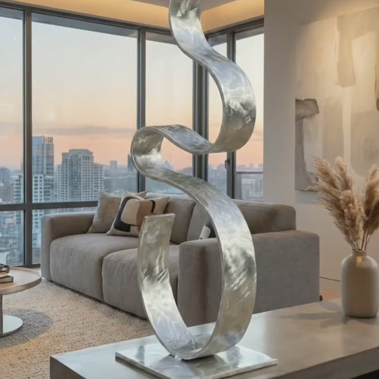 Each piece features a meticulously hand-brushed finish that catches the light from every angle, creating a dynamic focal point that shifts as you move around it. Mounted on a sleek, minimalist square base, this abstract artwork strikes the perfect balance between delicate, organic movement and architectural stability.