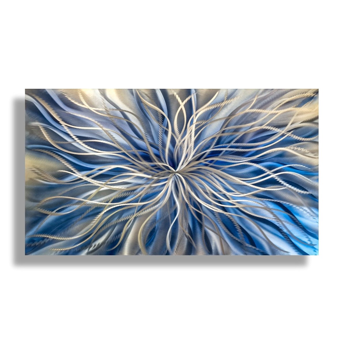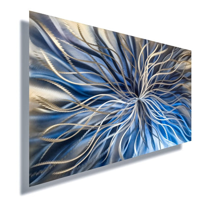 Introducing "Radiation" (Navy Blue Edition) – a handcrafted modern metal wall art piece by acclaimed UK artist Christopher Henderson. With its dynamic, etched patterns and a bold silver and navy blue colour scheme, this artwork adds a contemporary, sophisticated touch to any interior.