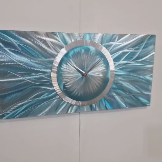 Unique Large Turquoise Clock – 24x12" Modern Blue Wall Sculpture & Metallic Art Decor
